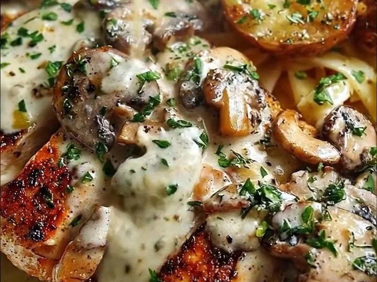 Greek Hot Honey Garlic Chicken Alfredo with Roasted Potatoes & Fig-Balsamic Mushroom Cream