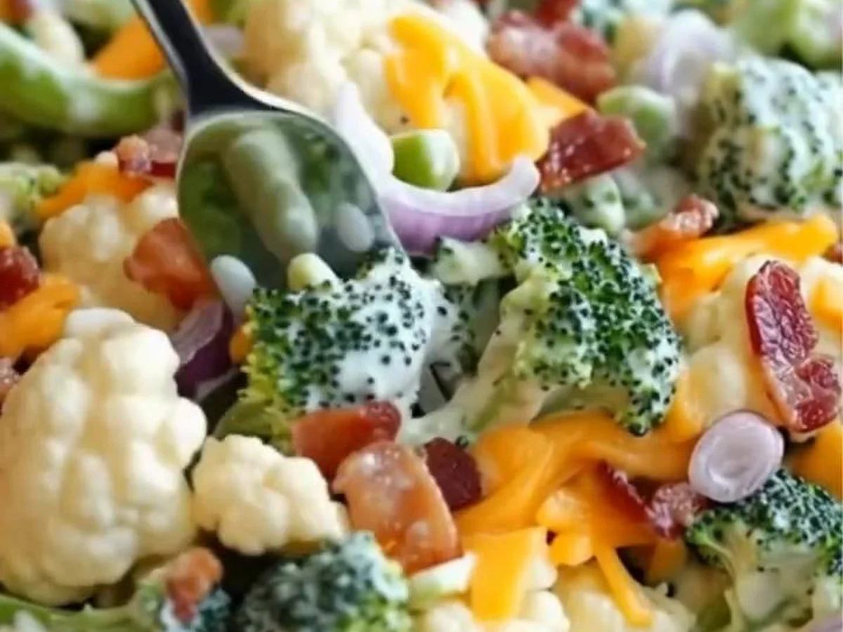 Creamy Broccoli and Cauliflower Salad Ingredients: – 3 cups broccoli florets – 3 cups cauliflower florets – ½ cup red onion, finely chopped – ½ cup shredded cheddar cheese – ½ cup crumbled bacon (optional) – ¼ cup sunflower seeds or slivered almonds (optional) – 1 cup mayonnaise – 2 tablespoons apple cider vinegar – 1 tablespoon sugar – Salt and pepper to taste Instructions: 1. In a large bowl, combine the broccoli florets, cauliflower florets, red onion, shredded cheddar cheese, and crumbled bacon if using. Toss gently to mix the ingredients evenly. 2. In a separate bowl, whisk together the mayonnaise, apple cider vinegar, sugar, salt, and pepper until well combined to create the dressing. 3. Pour the dressing over the vegetable mixture and stir gently to coat all the ingredients thoroughly. 4. If desired, fold in the sunflower seeds or slivered almonds for added crunch. 5. Cover the salad and refrigerate for at least 1 hour before serving to allow the flavors to meld. 6. Serve chilled as a side dish or a light main course option. Time & Calories: – Prep Time: 15 minutes – Chill Time: 1 hour – Total Time: 1 hour 15 minutes – Approximate Calories per Serving: 250 calories (based on 6 servings)