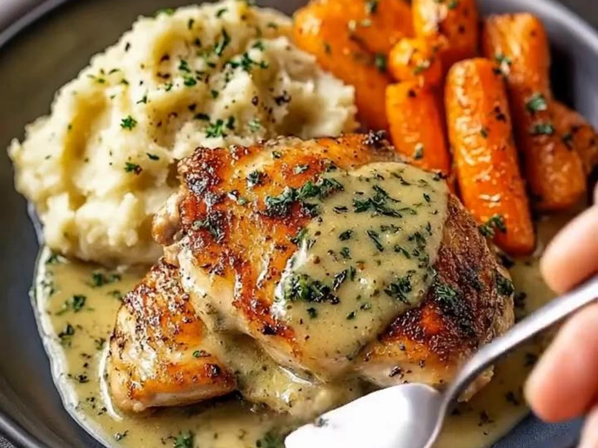 Creamy Herb Chicken Thighs with Buttery Mashed Potatoes and Honey-Roasted Carrots
