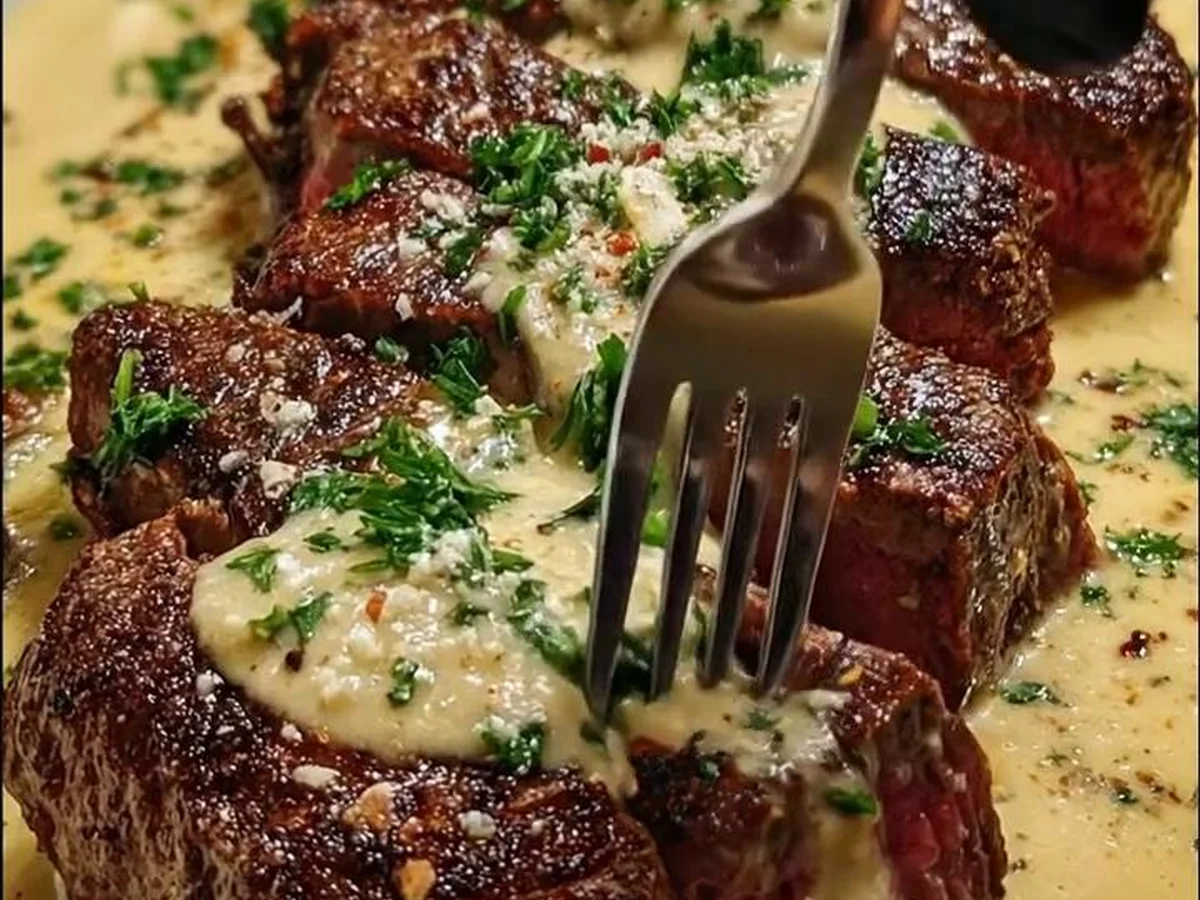 Juicy Steak with Creamy Garlic Sauce Ingredients: – 2 ribeye or sirloin steaks (about 1-inch thick) – 2 tablespoons olive oil – 4 cloves garlic, minced – 1 cup heavy cream – 1 teaspoon dried thyme (or your choice of herbs) – Salt and pepper to taste – Fresh parsley (for garnish, optional) Instructions: 1. Remove the steaks from the refrigerator and let them sit at room temperature for about 30 minutes before cooking. This helps them cook evenly. 2. Season both sides of the steaks generously with salt and pepper. 3. In a large skillet, heat the olive oil over medium-high heat. Once hot, add the steaks to the pan. 4. Cook the steaks for about 4-5 minutes on each side for medium-rare, or longer if you prefer them more done. Use a meat thermometer for precise doneness: 130°F (54°C) for medium-rare, 140°F (60°C) for medium. 5. Once cooked to your liking, remove the steaks from the skillet and set them aside to rest for at least 5 minutes. 6. In the same skillet, lower the heat to medium and add the minced garlic. Sauté for about 1-2 minutes until fragrant, but be careful not to burn it. 7. Pour in the heavy cream and stir to combine, scraping up any browned bits from the bottom of the pan. 8. Add the dried thyme and season the sauce with salt and pepper to taste. Let the sauce simmer for 3-4 minutes until it thickens slightly. 9. Return the steaks to the skillet, spooning the creamy garlic sauce over them. Allow them to soak up some of the sauce for about 1-2 minutes. 10. Serve the steaks hot, drizzled with creamy garlic sauce and garnished with fresh parsley if desired. Enjoy! Time & Calories – Total Time: 30 minutes – Estimated Calories: Approximately 650-800 calories per serving, depending on the size of the steak and the amount of sauce used.
